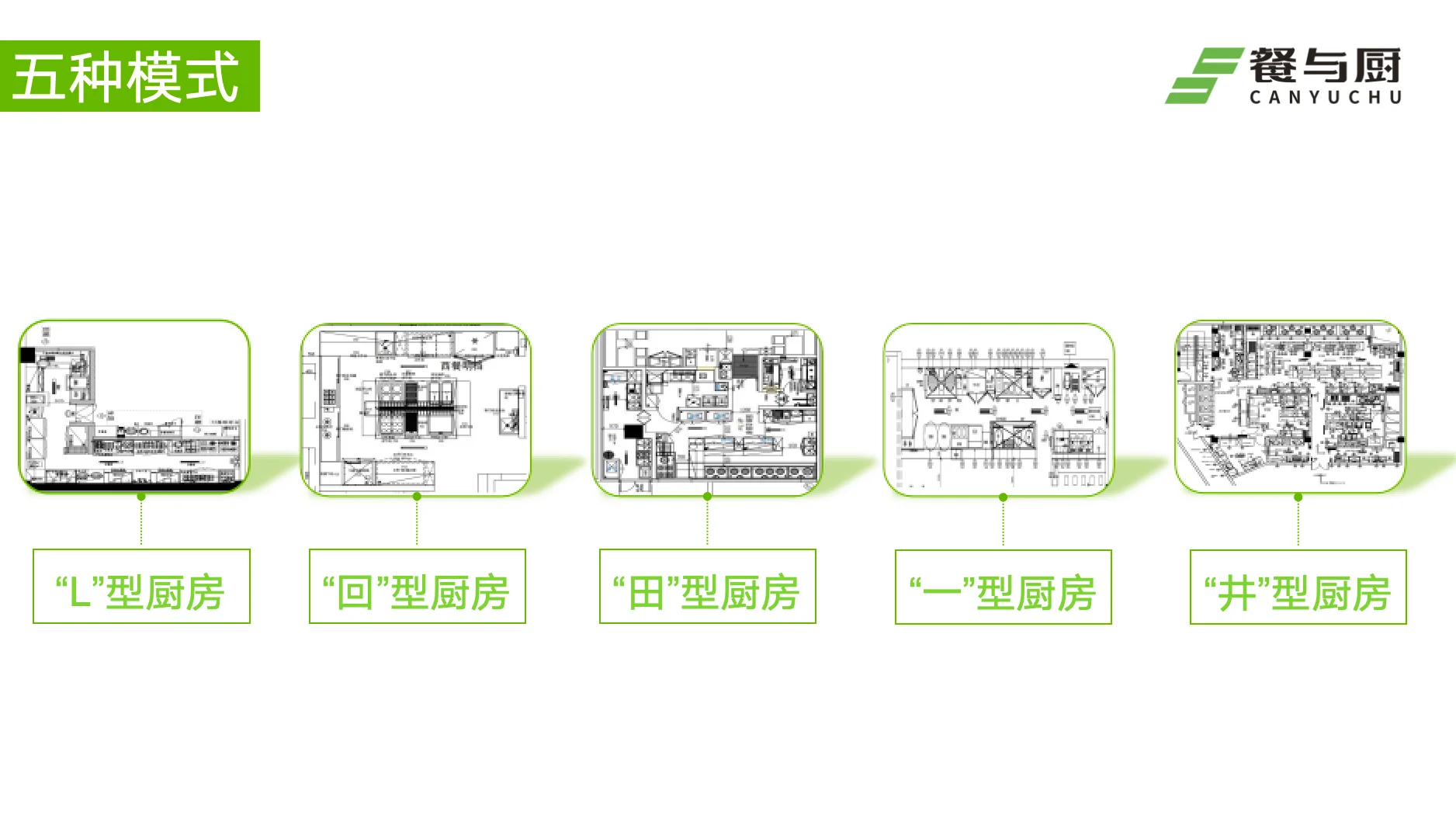五种厨房布局模式各具特色,可根据空间大小、 运营需求和功能定位灵活选择,实现高效、流畅的厨房运作。