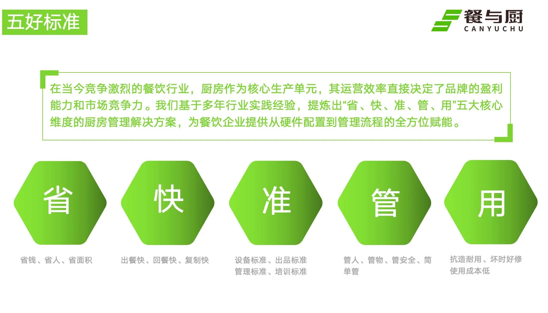 餐与厨以"省、快、准、管、用"五大维度重构厨房价值, 打造高效餐饮后端体系。 选择我们餐与厨,您将获得经过验证的厨房升级解决方案,让好味道与好生意完美结合。